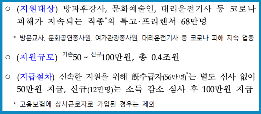 기존 1~4차 지원금을 받은 특고·프리랜서에게는 50만원을 지원하고, 그동안 지원을 받지 않았던 대상자에게는 새로 신청을 받아 소득 심사를 거쳐 최대 100만원을 지원한다.