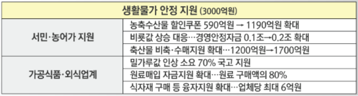생활물가 안정 지원에는 3000억원 예산이 결정되었습니다. 서민/농어가 지원과 가공식품이나 외식업계에도 지원을 한다고 합니다.