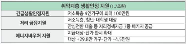 취약계층을 대상으로 지원되는 지원그은 긴급생활안정지원, 저리 금융지원, 에너지바우처 지원이 있습니다.