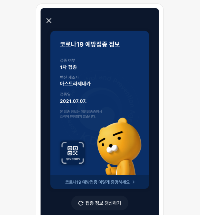 카카오톡 지갑 속 예방접종 정보는 본인의 예방접종 정보를 참고하는 용도로만 활용가능하다고 합니다. QR체크인으로 접종정보까지 한번에 간편하게 사용할 수 있습니다.