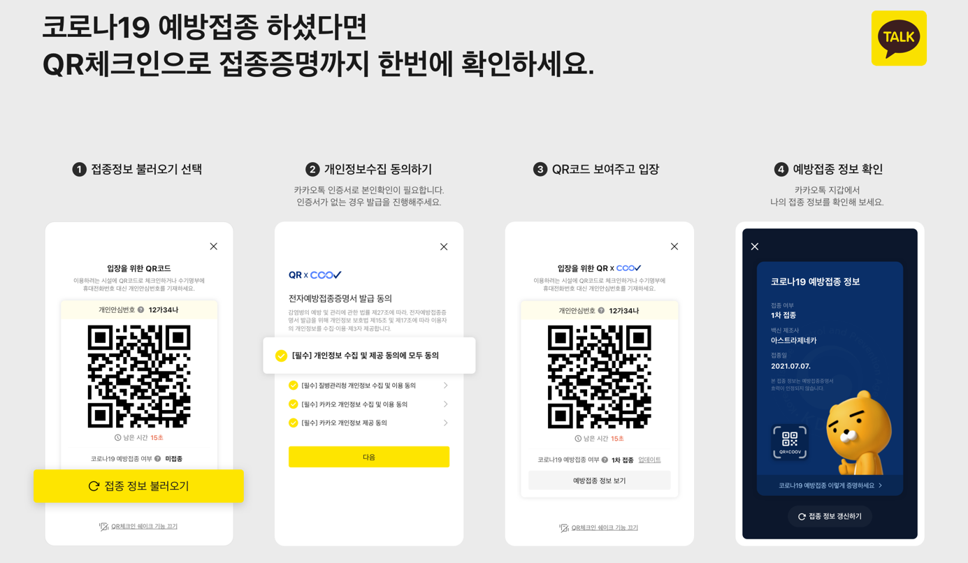 새로워진 QR체크인으로 접종 정보까지 한번에 등록됩니다. 만약 백신 접종을 했다면 훨씬 더 간편하게 카카오톡을 활용해보세요. 톡 안의 새로워진 QR체크인으로 예방 접종 정보까지 한번에 확인할 수 있습니다.