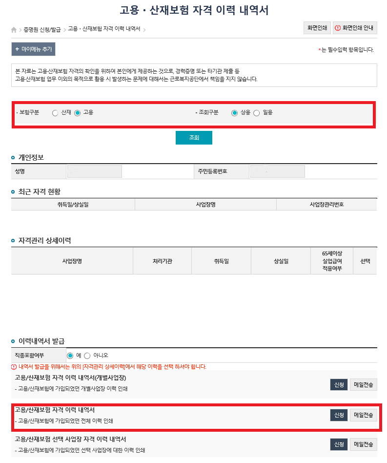 > 개인 > 고용·산재보험 자격 이력 내역서