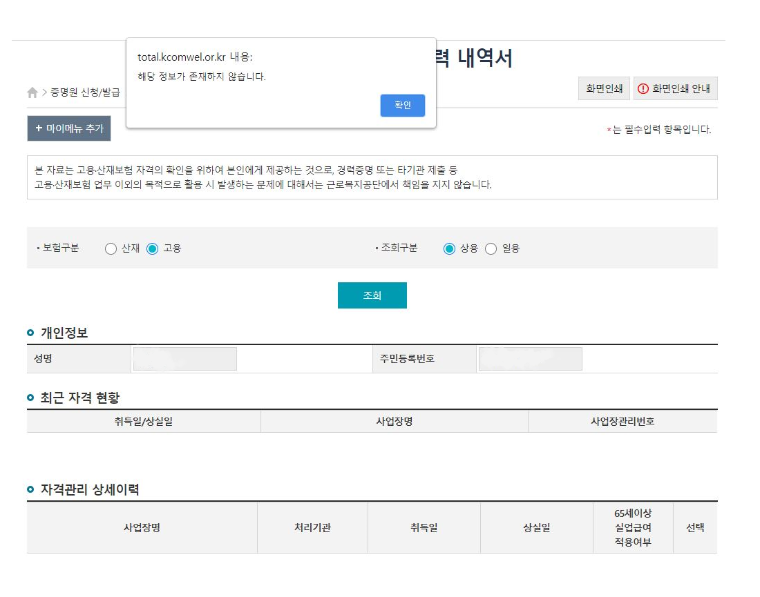 (2) 고용·산재보험 피보험 자격이력내역서를 눌렀을 때 다음 페이지로 넘어가지 않는 빈 화면 또는 '해당 정보가 존재하지 않습니다' 팝업창 나온 화면 캡쳐본