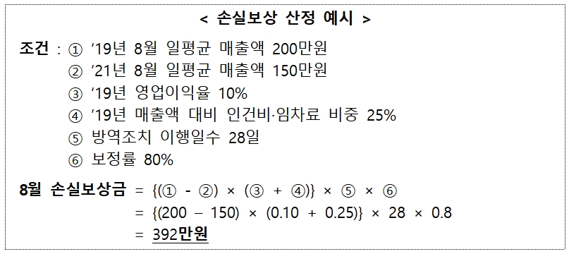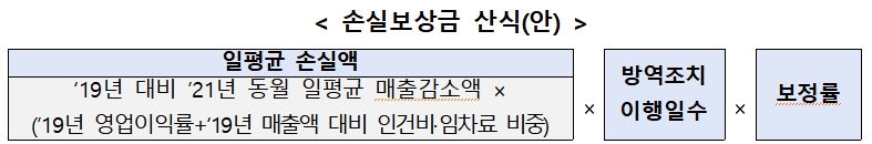 - 손실보상금은 2019년 대비 2021년 동월 일 평균 손실액에 방역조치 이행기간과 보정률을 적용하여 산정됩니다.