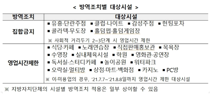 * 위 신청대상 조건 중 집합금지, 영업시간 제한조치에 따른 대상시설은 아래와 같습니다.