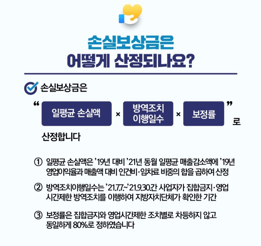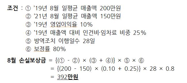손실보상액은 개별업체의 손실에 비례하게 맞춤형으로 산전된다고 하며, 코로나 19의 영향이 없었던 19년 대비 올해 동원 일평균 손실액과 방역 조치 이행기관과 보정률을 적용해 계산합니다.