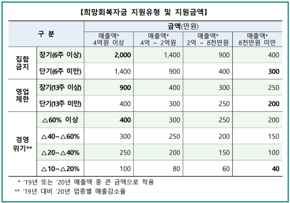 코로나로 인한 사회적 거리두기로 매출이 급감한 소상공인들을 위한 지원안으로 제시 된 소상공인 희망회복자금이 지급되었다. 지원유형과 기준에 따라서 적게는 40만원, 많게는 2,000만원까지 지급되는 지원안인데 조금 헷갈리는 내용이 많아 정리해보려고 한다.