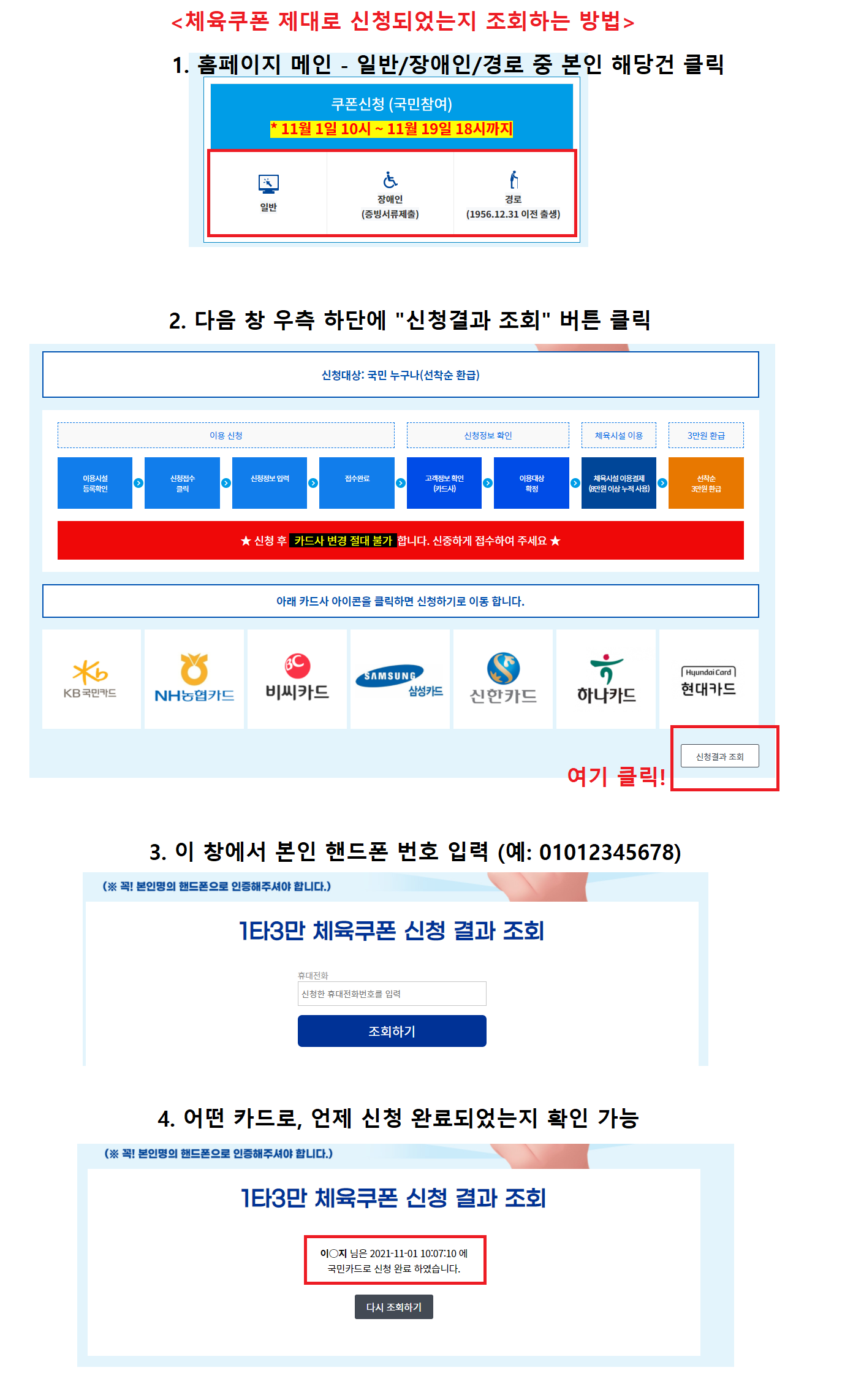 1타3만 체육쿠폰 받아보세요. 3만원 환급을 위한 체크리스트를 확인해보세요. 신청 후 바로 결제하면 안되며, 11월 26일 승인문자를 받은 이후 카드결제가 가능합니다. 신청한 카드로 결제해야 하고, KB국민카드, NH농협카드, 비씨카드, 삼성카드, 신한카드, 하나카드, 현대카드로 신청하면 됩니다.