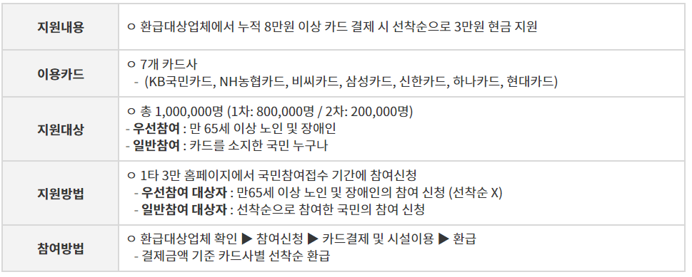 환급 대상업체에서 누적 8만원 이상 카드 결제 시 선착순으로 3만원 현금 지원을 합니다.