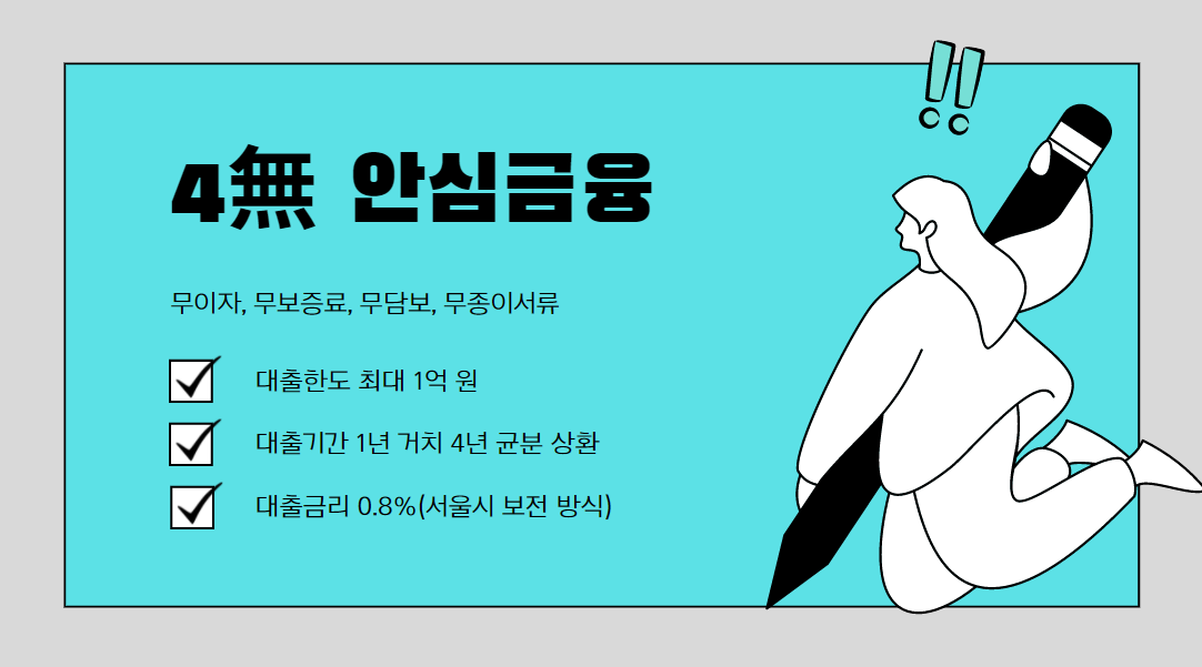 서울시 신용보증재단에서 진행하는 4無 안심금융을 신청해보자, 무이자, 무보증료, 무담보, 무종이서류로 신청할 수 있습니다. 대출한도 최대 1억 원, 대출기간 5년(1년 거치, 4년 균분 상환), 대출금리 0.8%(서울시 보전 방식)입니다.