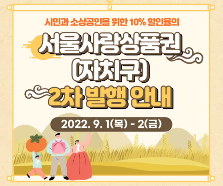 서울사랑상품권(자치구)가 9월 1일 발행됩니다. 추석이 다가오면서 서울시는 시민들의 물가 부담을 조금이라고 덜어주기 위해 약 5천억원 규모로 '서울사랑상품권(자치구)'를 발행합니다. 서울사랑상품권은 10% 할인된 금액으로 구매할 수 있으며 자치구별로 발행힐과 시간이 다르기 때문에 꼭 확인해야합니다.