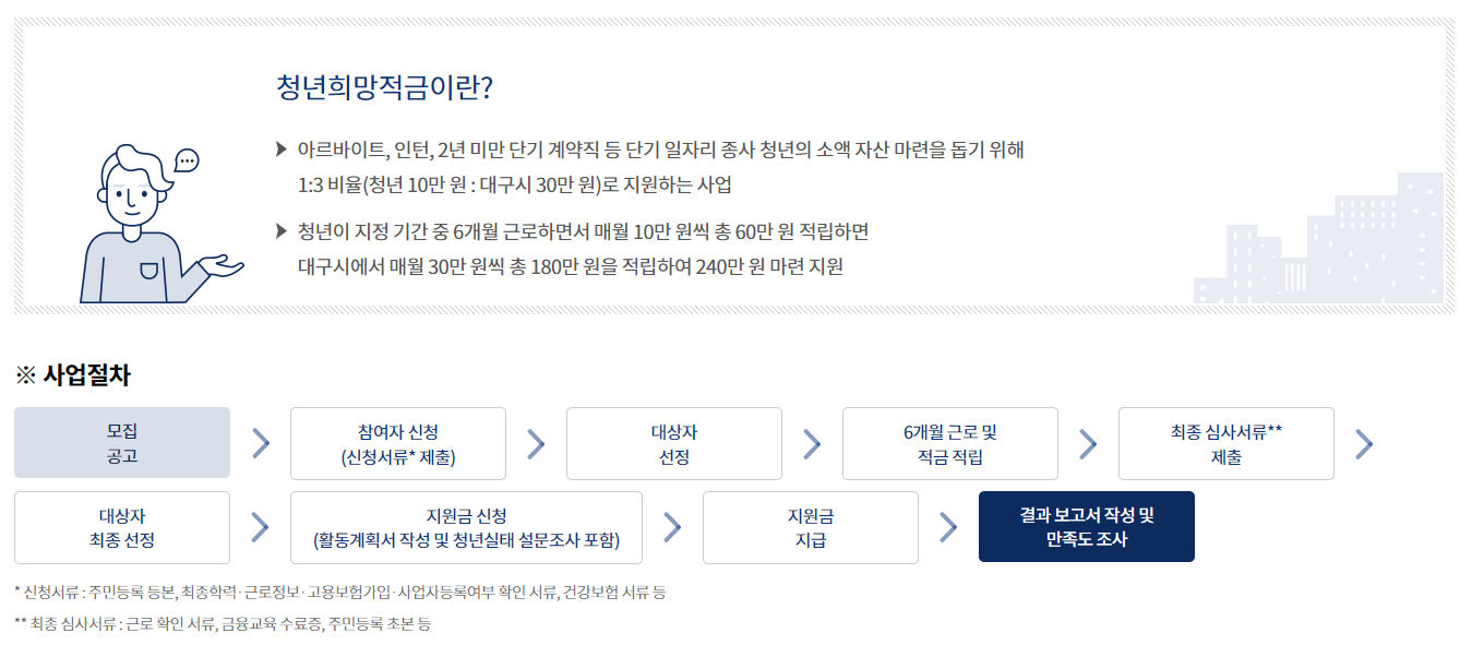 - 청년이 6개월간 매월 10만 원씩 총 60만 원 저축하면, 대구시가 30만 원씩 총 180만원 적립하여 지급조건을 충족한 청년에게 지원